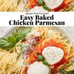 To make gluten-free baked chicken parmesan, use gluten-free breadcrumbs and serve with gluten-free pasta, zoodles, or cooked spaghetti squash. To make dairy-free baked chicken parmesan, use dairy-free grated parmesan and mozzarella.